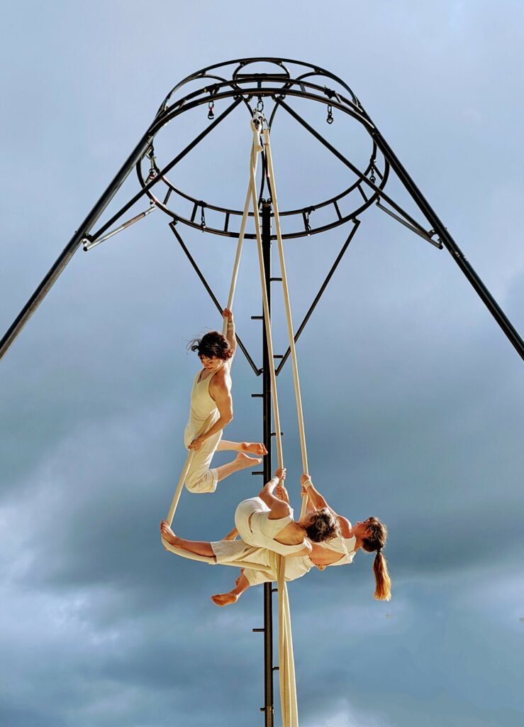 Sur scène sont réunis 3 corps de femmes et 6 cordes de coton. Suspendues à une grande coupole ronde, elles évoluent, ensemble, communicant par ce langage commun qu’articulent leurs corps aériens.